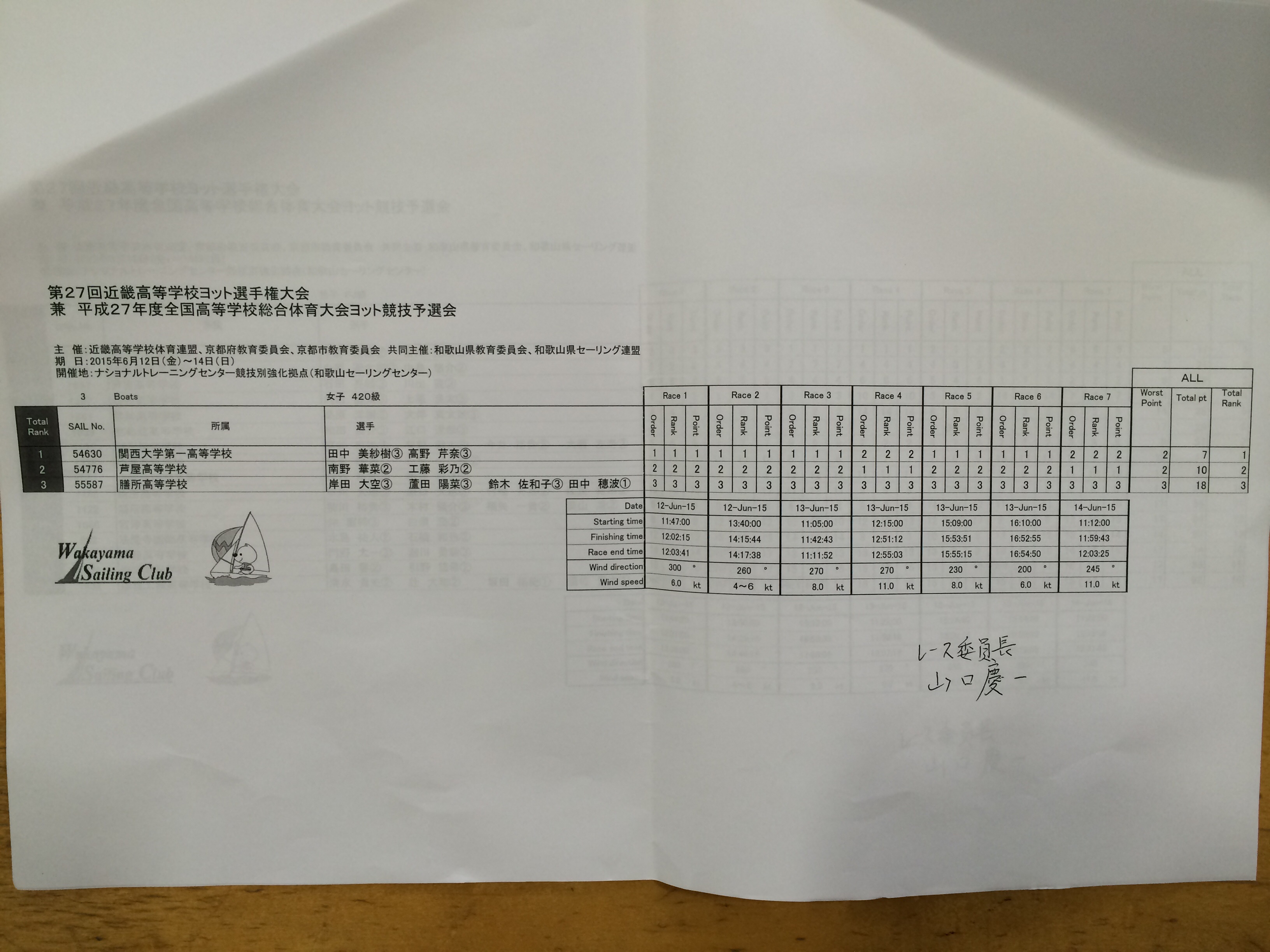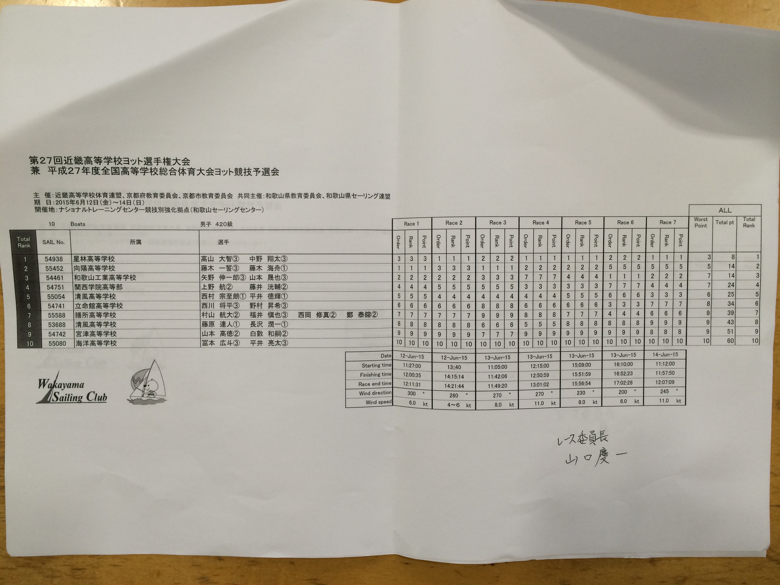 今年度からインターハイに出場できるのは各種目ごとに各校一艇までとなり、男子、女子FJ級は上位3校、男子420級は上位4校、女子420級は上位2校でした。また、デュエット競技は廃止されました。残念ながらインターハイ出場は叶いませんでしたが、高校ヨットの集大成として、最終レースに全力で取り組まれたと思います。大学でもヨットを続けられる方は、今大会を糧に頑張って欲しく思います。