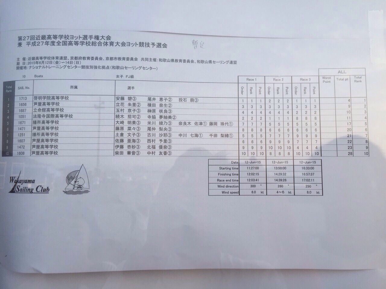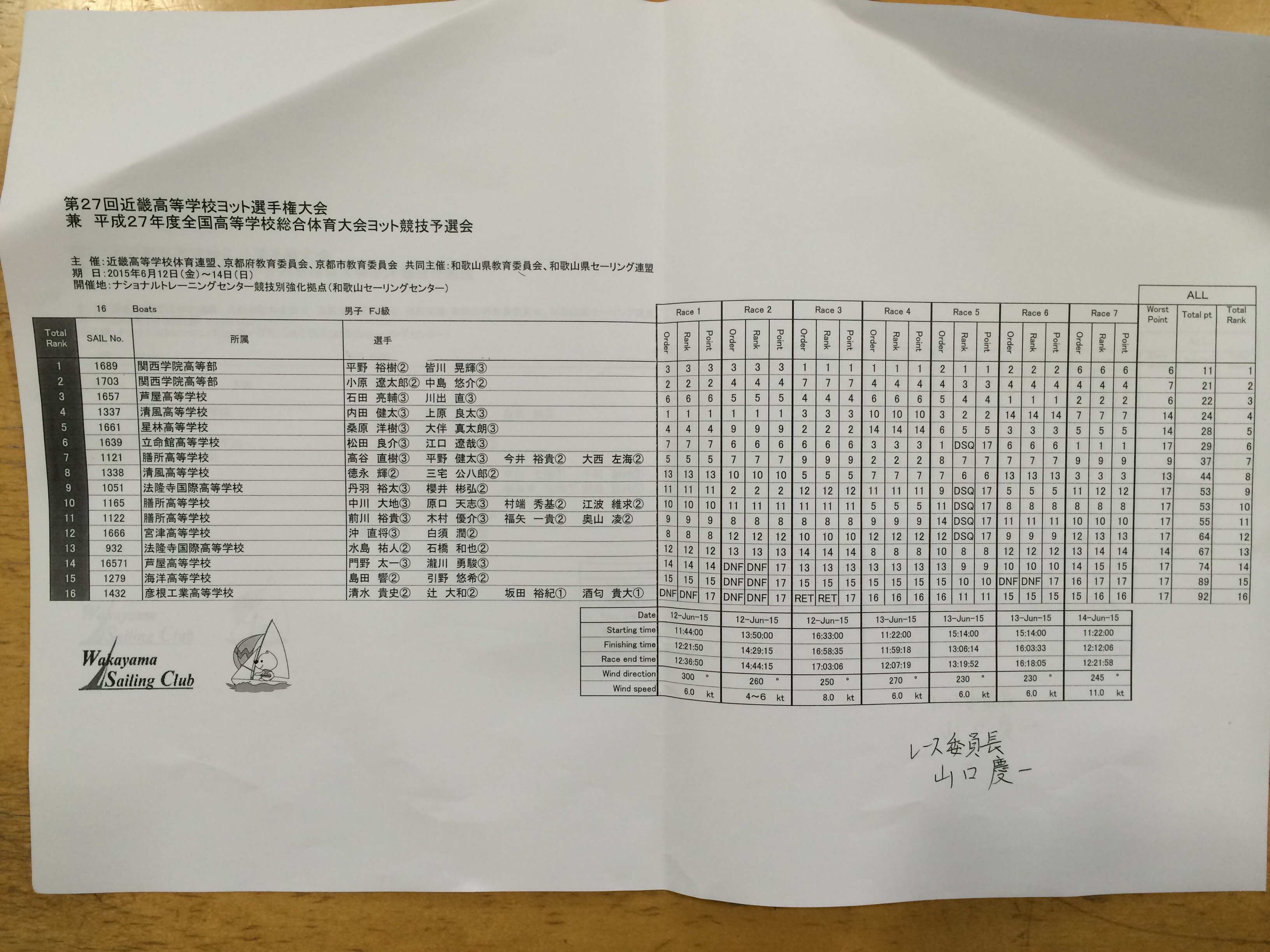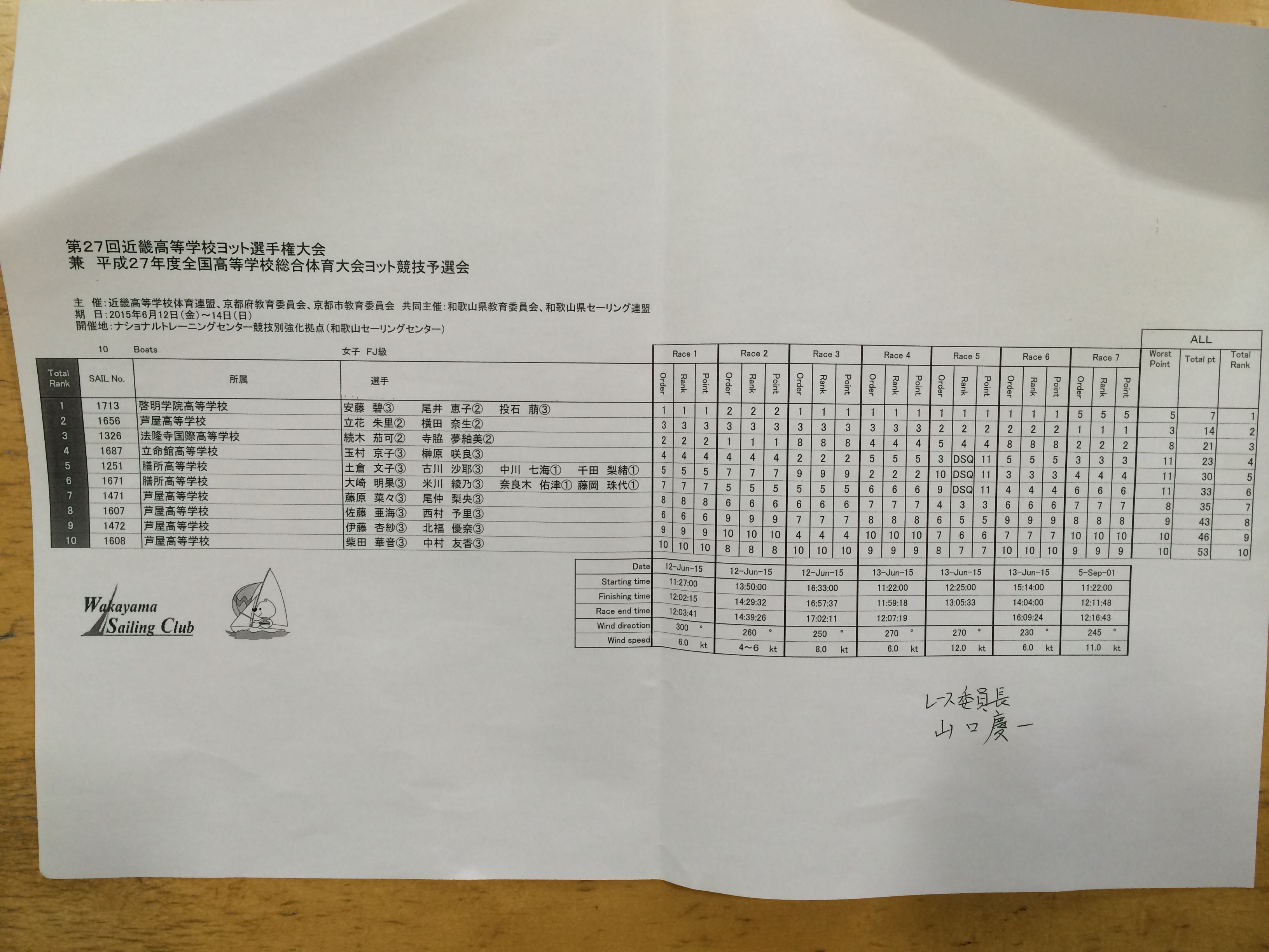 今年度からインターハイに出場できるのは各種目ごとに各校一艇までとなり、男子、女子FJ級は上位3校、男子420級は上位4校、女子420級は上位2校でした。また、デュエット競技は廃止されました。残念ながらインターハイ出場は叶いませんでしたが、高校ヨットの集大成として、最終レースに全力で取り組まれたと思います。大学でもヨットを続けられる方は、今大会を糧に頑張って欲しく思います。